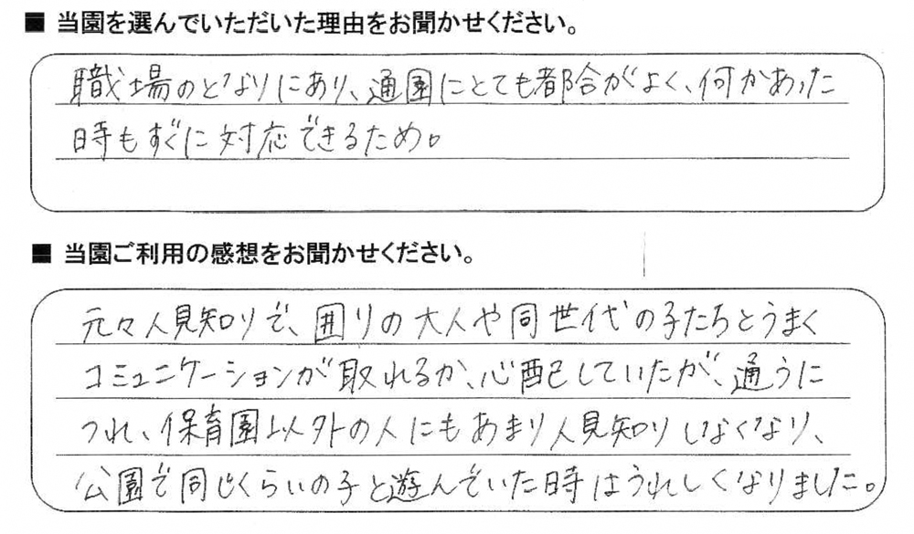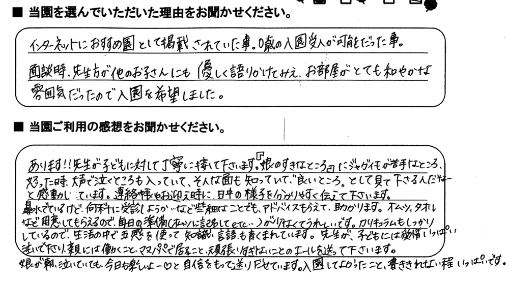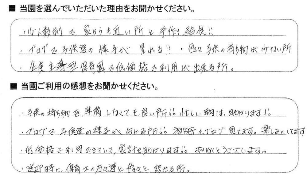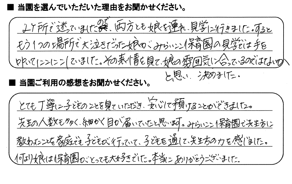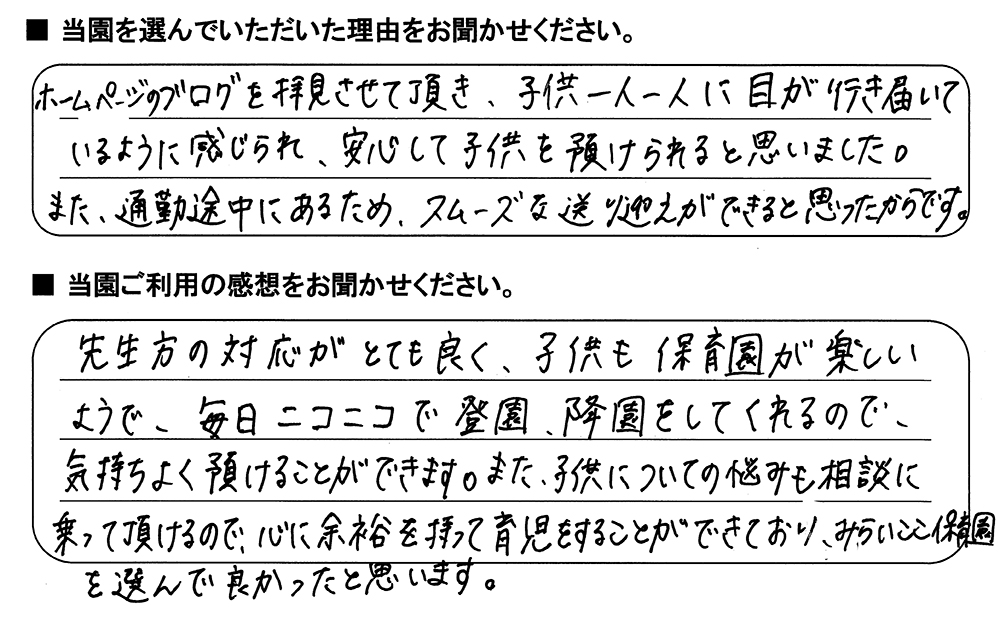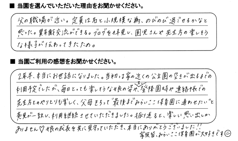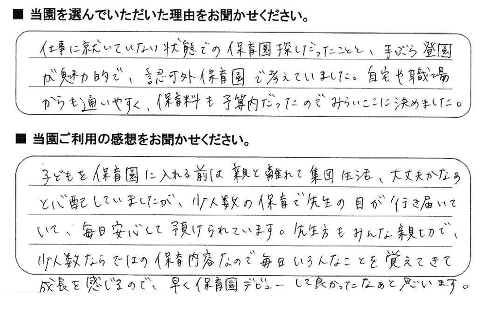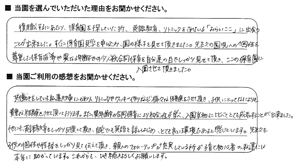 みらいここ保育園を利用された皆さまからの